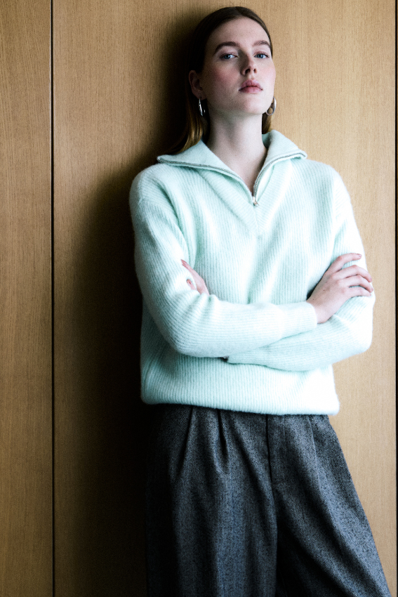 Munt groene pull met ritssluiting. Deze trui combineert op koude dagen ideaal met bruin, donker blauw of zelfs jeans voor een frisse, doch warme winterlook. Samenstelling: een mix van polyamide, wol, alpaca en elastane.